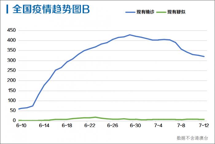 7月12日,全国无新增疑似病例,现有疑似病例7例。尚在医学观察人数持续下降,全国解除医学观察的密切接触者538人,尚在医学观察的密切接触3494人。