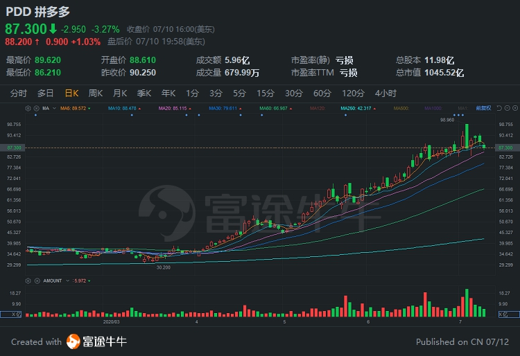 2、拼多多股价在连续上涨多日后,本周回调6.13%。本周7月6日该公司股价一度上涨至100美元关口附近。