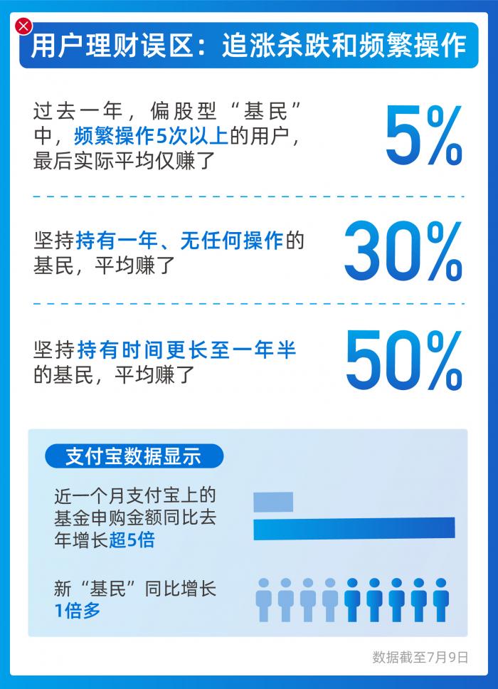 近日A股连续暴涨,理财市场也随之走热。数据显示,近一个月支付宝上的基金申购金额同比去年增长超5倍, 新“基民”同比增长1倍多。不过股市、基金上涨,不代表普通投资者都能赚到钱, 根据支付宝的统计,频繁操作的基民成为这波小牛行情中最为“受伤的人”。 支付宝理财平台的数据显示,截至7月10日,购买了偏股型基金的“基民”中,频繁操作5次以上的人,一年下来平均仅赚了5%,而坚持持有一年、拿住不动的用户,平均赚了30%。如果坚持持有了一年半的用户,平均能赚50%。也就是说,基金越拿得住,持有时间越长,越可能多赚。