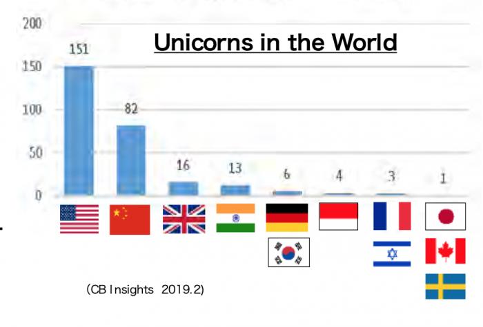 另据CBInsights的统计2019年全球共有310家独角兽公司,其中美国公司151家,中国公司82家,相比之下日本只有1家企业上榜。另外,在“超级独角兽”(价值超过100亿美元的新兴企业)之列,2018年全球共22家,美国12家,中国7家,日本为零。