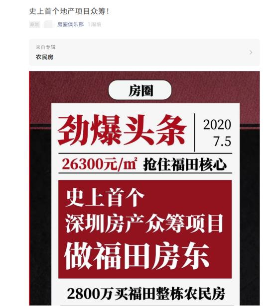 7月5日,某公众号推送了一条名为《史上首个地产项目众筹!》的文章。