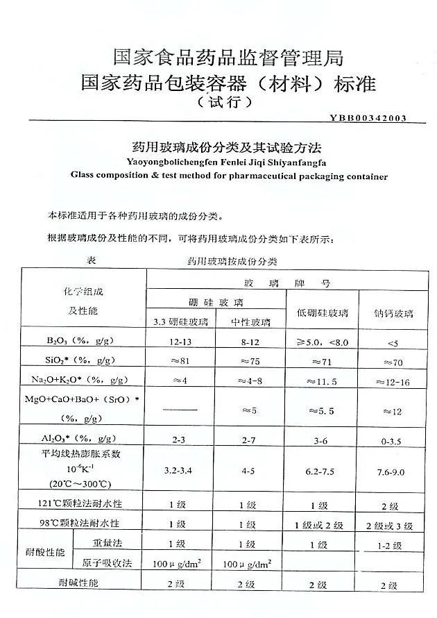 另据了解,药用玻璃检测标准是没有国标的,只有两项检测方法标准和玻璃管产品标准,而且药用玻璃管标准是95年颁发实施的。国家食品药品监督管理局YBB00342003-2015将药用玻璃的成分及性能进行规定。