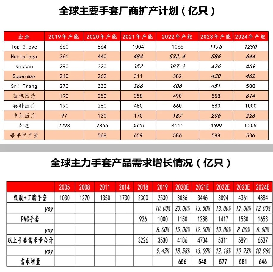 因此方正证券认为,考虑到设计产能完全投产需要1年左右时间,且产能利用率不一定保持在100%,龙头企业扩产计划与全球主力手套需求增长是匹配的。