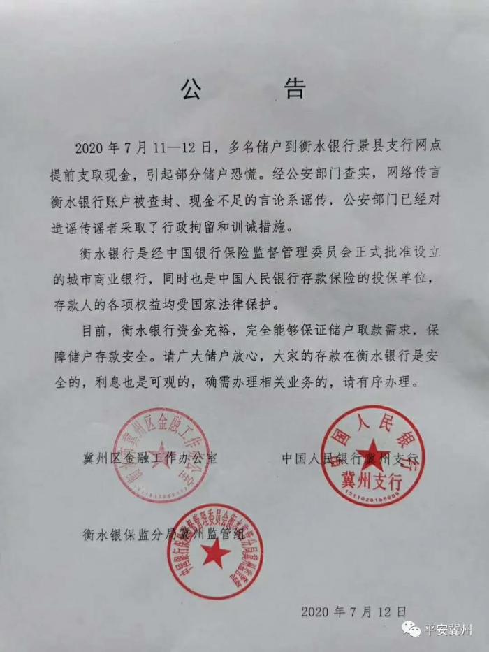 7月13日,河北省衡水市冀州区委政法委官方公众号“平安冀州”发布由冀州区金融工作办公室、中国人民银行冀州支行、衡水银保监分局冀州监管组联合署名的公告称,经公安部门查实,网传衡水银行账户被查封、现金不足的言论系谣传,公安部门已对造谣传谣者采取了行政拘留和训诫措施。