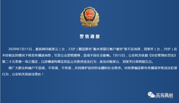 根据河北景县公安局发布的警情通报,7月11日,景县网民杨某云(女,33岁)臆造散布“衡水某银行账户被封”等不实消息,刘某芳(女,39岁)在未经核实的情况下转发传播该消息,引发公众恐慌情绪,造成不良社会影响。7月12日,公安机关依据《治安管理处罚法》第二十五条第一项之规定,以涉嫌虚构事实扰乱公共秩序违法行为,依法对杨某云、刘某芳行政拘留五日。