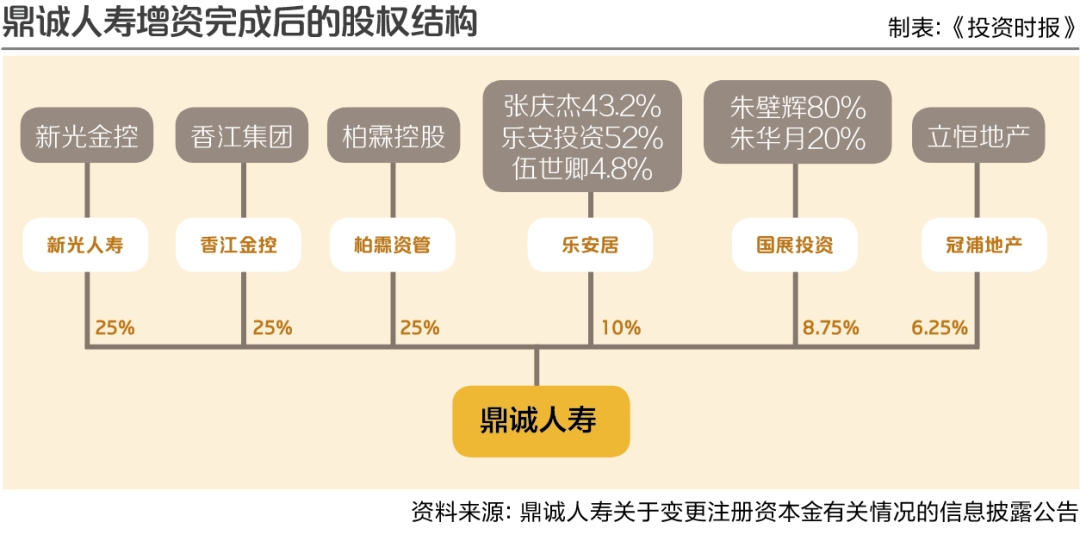 《投资时报》研究员注意到,增资完成后,新光人寿保险股份有限公司(下称新光人寿)不再是鼎诚人寿单一大股东,深圳市前海香江金融控股集团有限公司(下称香江金控)、深圳市柏霖资产管理有限公司(下称柏霖资管)与之并列为第一大股东,持股比例均为25%。
