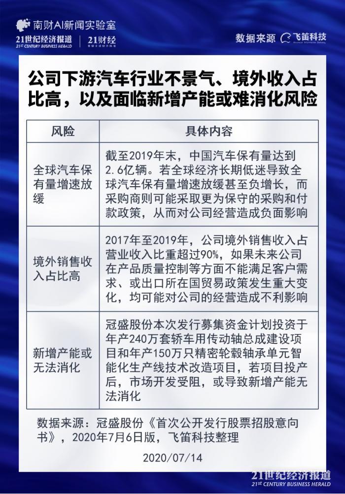 冠盛股份于7月6日发布的招股说明书中提示了多个风险点。经南财AI新闻实验室梳理,有三大风险点跟公司经营高度相关,分别是全球汽车保有量增速放缓、境外销售占比高,以及新增产能或无法消化的风险。