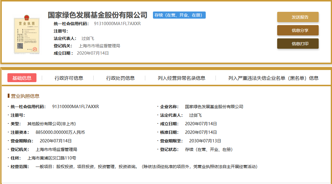 7月14日,工商注册资料显示,国家绿色发展基金股份有限公司成立,注册资本885亿元。
