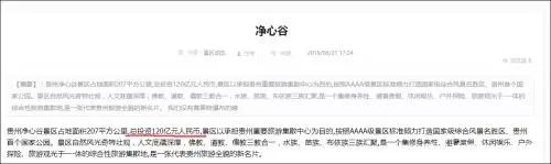 贵州净心谷景区到底投资了多少钱,连景区方面也说不清楚。在贵州净心谷景区官网的一篇介绍里,提到景区总投资120亿人民币。