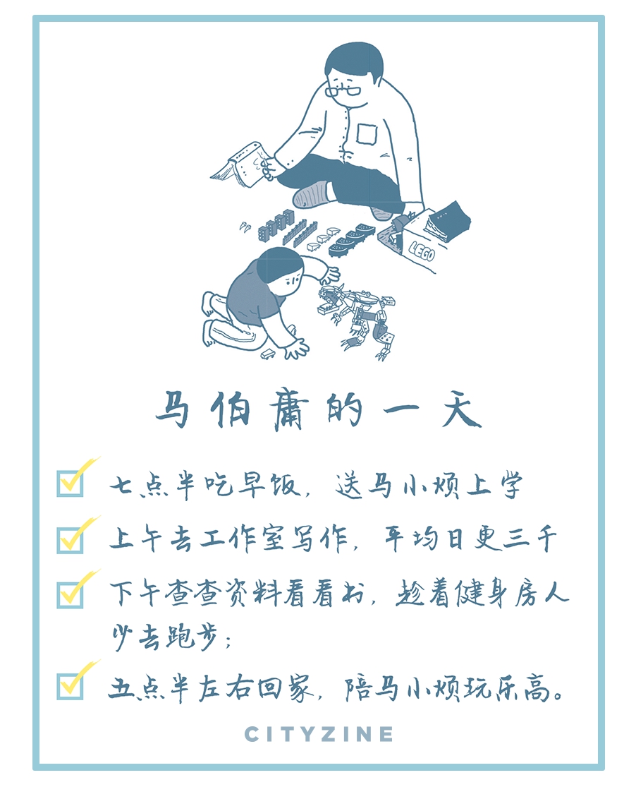 回到北京,写作和带儿子就成了马伯庸的重头戏。他自诩日常在北京的生活,“就跟上班族一样”,天天都得写。他原本酷爱在人潮汹涌的咖啡馆里边听邻桌八卦边写作,近几年因为送孩子上学起得太早好多咖啡店还没开门,就在家附近搞了个工作室。