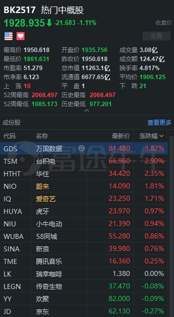 大型中概股中,阿里巴巴跌1.23%,拼多多跌1.08%,京东跌0.27%,好未来跌1.68%,中通快递跌1.14%,新东方跌2.26%,百济神州涨11.24%,爱奇艺涨1.71%,蔚来涨1.81%,携程跌2.76%,哔哩哔哩跌2.94%。