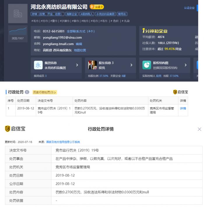 短片中提到的“永亮”毛巾,全名为河北永亮纺织品有限公司,启信宝数据显示,该企业在2019年8月就曾因“在产品中掺杂、掺假,以假充真,以次充好,或者以不合格产品冒充合格产品”原因受到当地市场监管局处罚,处罚金额仅为2700元,并没收非法财物300元。