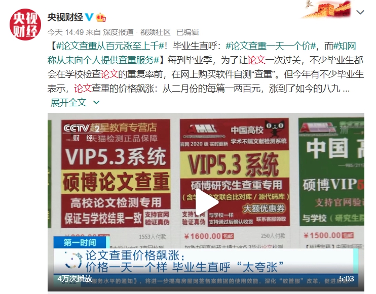 据央视财经报道,在某电商平台上看到,一篇硕士论文查重的费用从一百多元,到一千多元不等。某高校硕士毕业生小王表示,“4月17 、18号查时,每篇论文270元,而5月底在提交论文的时候,已经涨到580元了。”除了价格一天一个样,在临近毕业期间,商家还会对论文查重的账号,设置严格的期限。