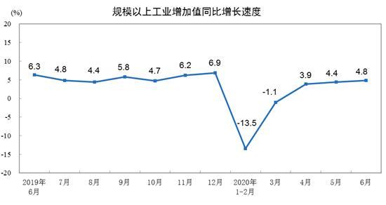 上半年,全国规模以上工业增加值同比下降1.3%,降幅比一季度收窄7.1个百分点;其中,二季度增长4.4%,一季度为下降8.4%。6月份,规模以上工业增加值同比增长4.8%,增速比5月份加快0.4个百分点,连续3个月增长;环比增长1.3%。