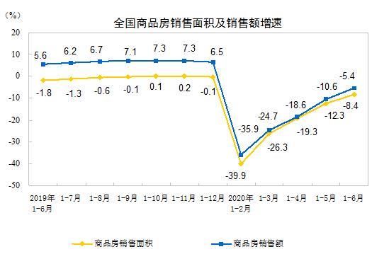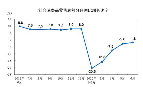 上半年,社会消费品零售总额172256亿元,同比下降11.4%,降幅比一季度收窄7.6个百分点;其中二季度下降3.9%,比一季度收窄15.1个百分点。6月份,社会消费品零售总额33526亿元,同比下降1.8%,降幅比5月份收窄1.0个百分点;环比增长1.34%。