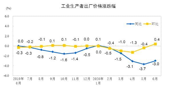 上半年,全国工业生产者出厂价格同比下降1.9%;其中6月份同比下降3.0%,环比上涨0.4%。上半年,全国工业生产者购进价格同比下降2.6%;其中6月份同比下降4.4%,环比增长0.4%。