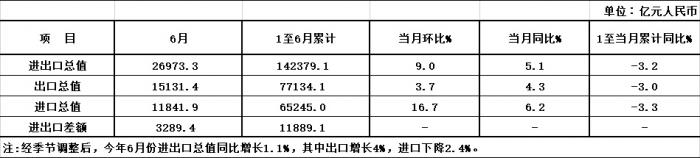 上半年,一般贸易进出口占进出口总额的比重为60.1%,比上年同期提高0.4个百分点。机电产品出口占出口总额的比重为58.6%,比上年同期提高0.5个百分点。6月份,进出口总额26973亿元,同比增长5.1%;出口15131亿元,增长4.3%;进口11842亿元,增长6.2%。上半年,全国规模以上工业企业实现出口交货值54250亿元,同比下降4.9%,降幅比一季度收窄5.4个百分点;其中,6月份实现出口交货值由5月份同比下降1.4%转为增长2.6%。