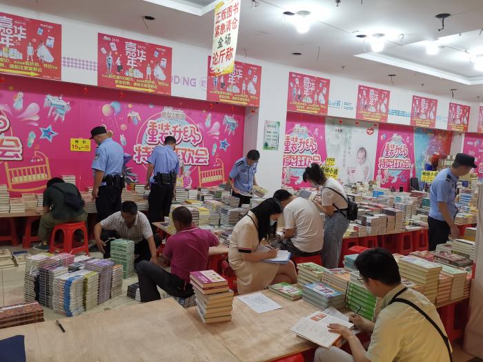 (图:安徽滁州执法人员现场清点涉案非法少儿出版物)