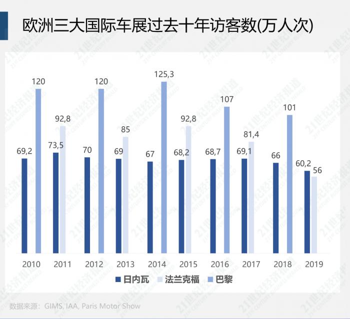 其中最为惨淡的是2019年法兰克福车展,其访客数仅为56万人,比上一届减少了24万人;日内瓦车展在2019年交出的50余万人次答卷相比于2016年的63万人次也缩水严重;相对稳定的巴黎车展虽然能够保持100万人次左右的访客数量,但是也难以恢复2000年的150万人次的巅峰。