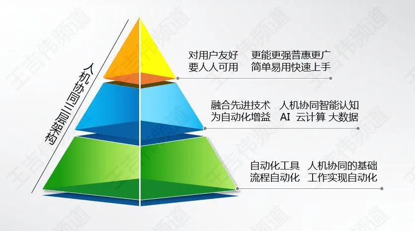 从人机交互的发展来看,在技术发展、生产经营、信息孤岛、流程桎梏、人力瓶颈等综合因素的影响之下,人机协同的模型架构也在向三层架构演变。同时,三层架构也代表着人机协作发展的三个阶段。