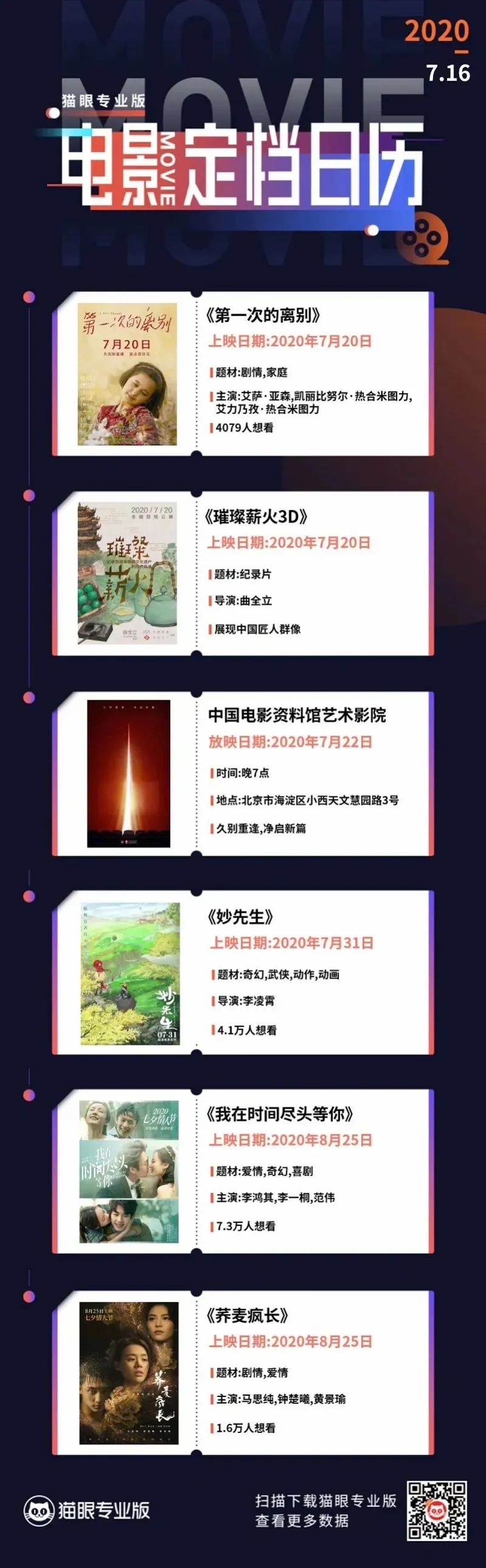 首批定档的影片已确定为:7月20日上映的《第一次离别》、《璀璨薪火3D》;7月22日上映的《中国电影资料馆艺术影院》;7月31日上映的《妙先生》;8月25日上映的《我在时间尽头等你》、《荞麦疯长》。