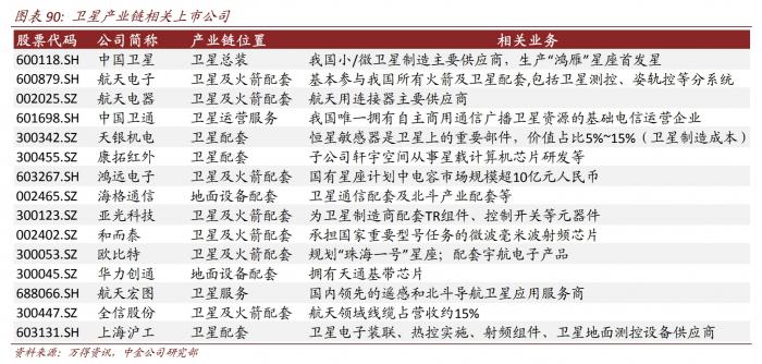 根据中金公司研报梳理,目前A股卫星产业链已有从卫星、火箭配套到运营的15家卫星产业链上市公司,包括布局卫星总装的中国卫星,布局卫星及火箭配套的航天电子、航天电器,布局卫星运营服务的中国卫通、布局卫星服务的航天宏图等。这其中核心企业多为“国家队”。
