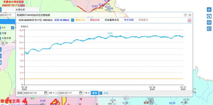 再看五洲村所属的芜湖市,安徽省水情监视图显示,近半周以来,芜湖站的水位一直在12.6米上下浮动,远高于11.2米的警戒水位。
