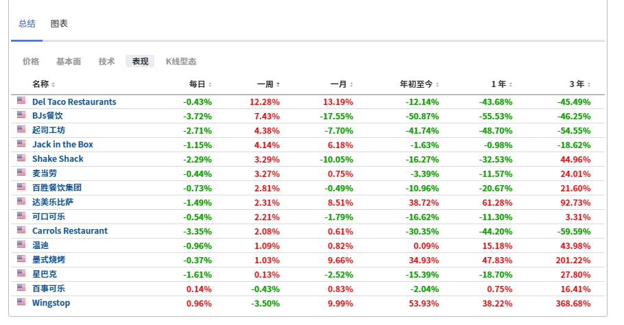 美国餐饮行业部分公司股价表现列表,来自英为财情Investing.com