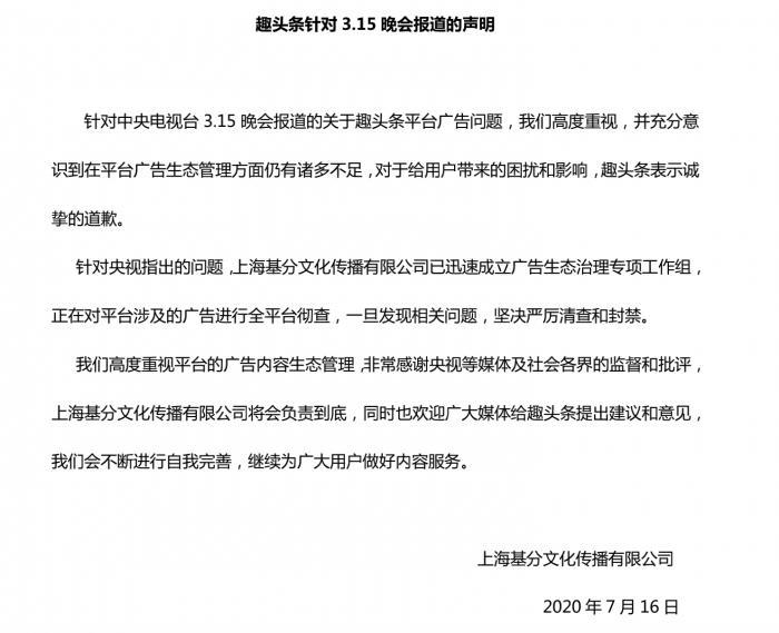 趣头条针对3.15晚会报道发布声明称,针对中央电视台3.15晚会报道的关于趣头条平台广告问题,我们高度重视,并充分意识到在平台广告生态管理方面仍有诸多不足,对于给用户带来的困扰和影响,趣头条表示诚挚的道歉。针对央视指出的问题,上海基分文化传播有限公司已迅速成立广告生态治理专项工作组,正在对平台涉及的广告进行全平台彻查,一旦发现相关问题,坚决严厉清查和封禁。
