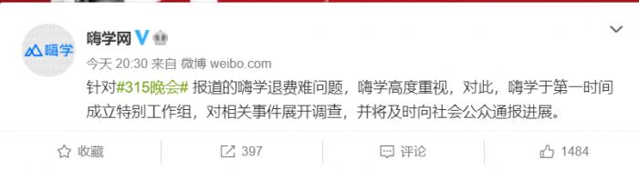 针对央视3.15晚会曝光的嗨学网问题,朝阳区市场监督管理局高度重视,将立即对北京嗨学网教育科技股份有限公司和北京嗨学卓奥教育科技有限公司进行调查,对调查属实的违法行为将一查到底,严厉惩处。
