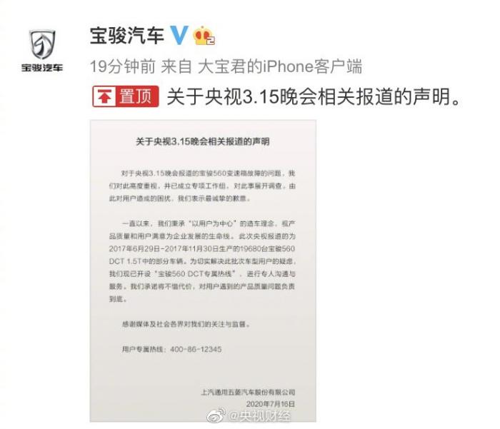 当晚21点22分,宝骏汽车官方微博回应称:对于央视3·15晚会报道的宝骏汽车560变速箱故障的问题,我们对此高度重视,并已成立专项工作组,对此事展开调查,现已开设“宝骏560 DCT专属热线”,由此对用户造成的困扰,表示最诚挚的歉意。