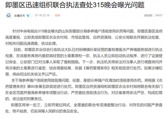 即墨区:针对中央电视台315晚会曝光的山东即墨部分海参养殖户违规使用农药等问题,即墨区委区政府高度重视,立即责成即墨区农业农村局、市场监管局、自然资源局、公安分局联合开展执法检查,对相关问题迅速调查、依法处理。
