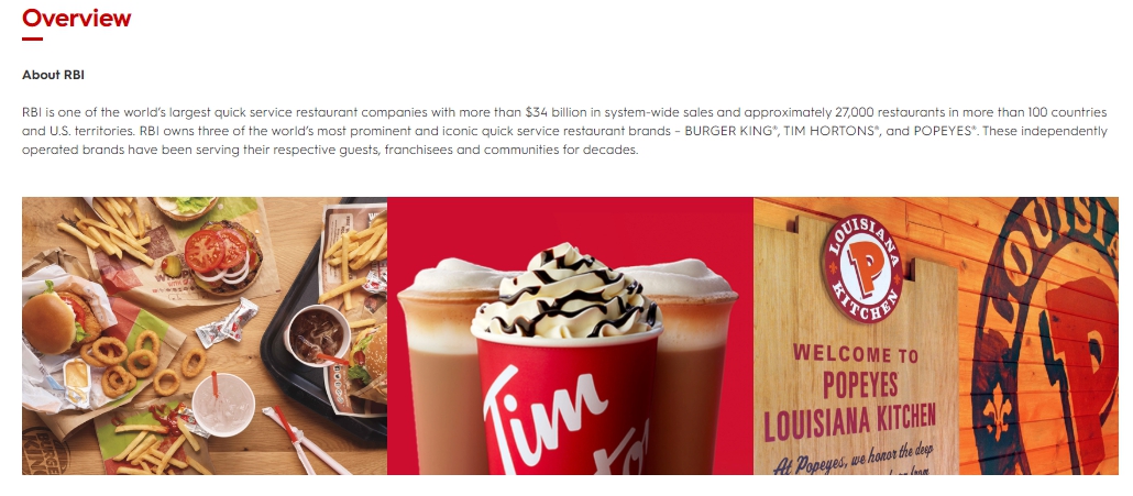 小食代今天浏览RBI集团官网发现,其在100多个国家和地区中拥有约2.7万家餐馆,全系统销售额超过340亿美元。除了汉堡王,RBI还拥有TIM HORTONS咖啡及POPEYES炸鸡。目前,上述三个品牌均已在中国开店。