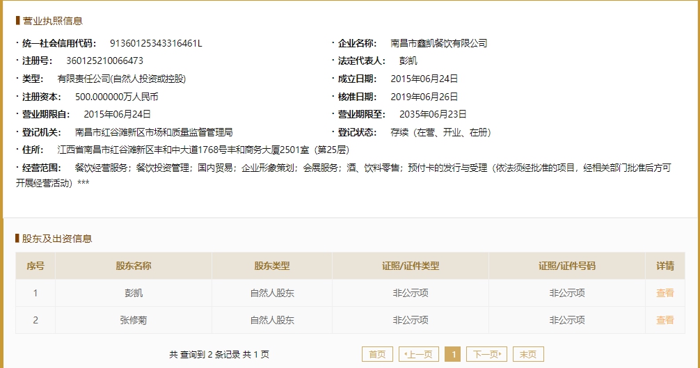 小食代查看工商资料发现,南昌鑫凯成立于2015年, 注册资本500万人民币。其两大股东分别为彭某、 张某某,前者是南昌鑫凯执行董事,后者则是该公司监事。
