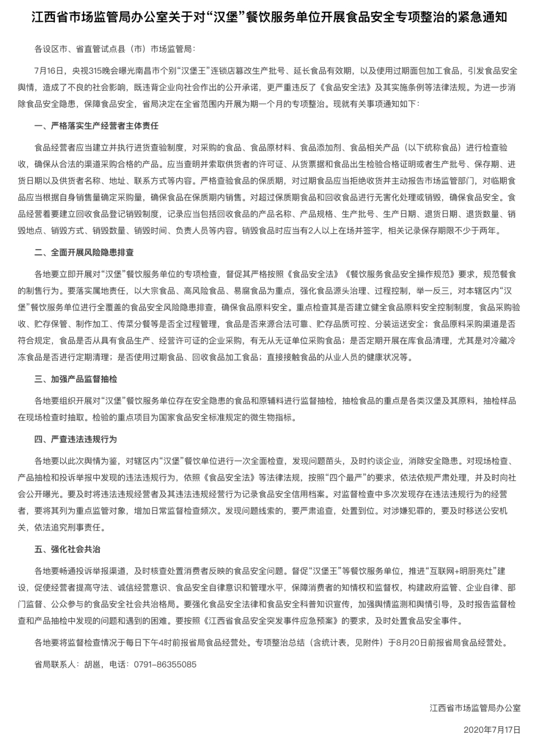 在3·15晚会后,多地市场监管局也对辖区内的汉堡王餐厅进行了“突击检查”,重点包括食材保质期的相关内容。就在今天傍晚,江西宣布决定从即日起在全省开展为期一个月的“汉堡”餐饮服务单位食品安全专项整治。