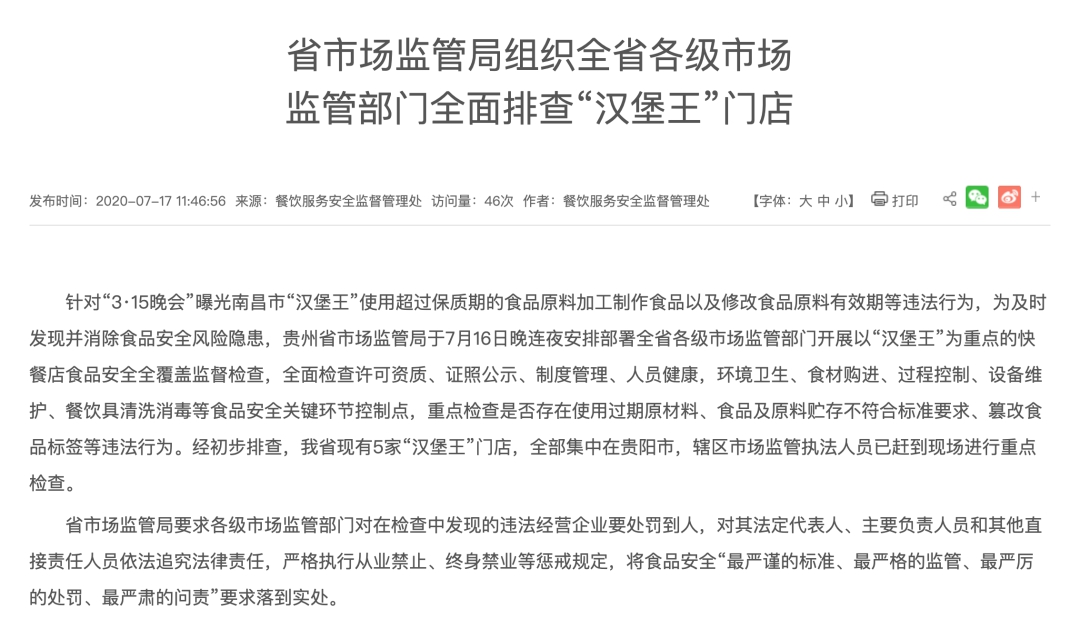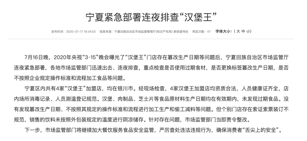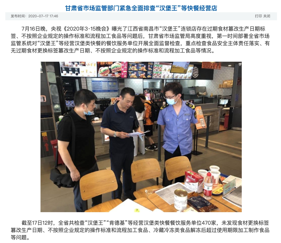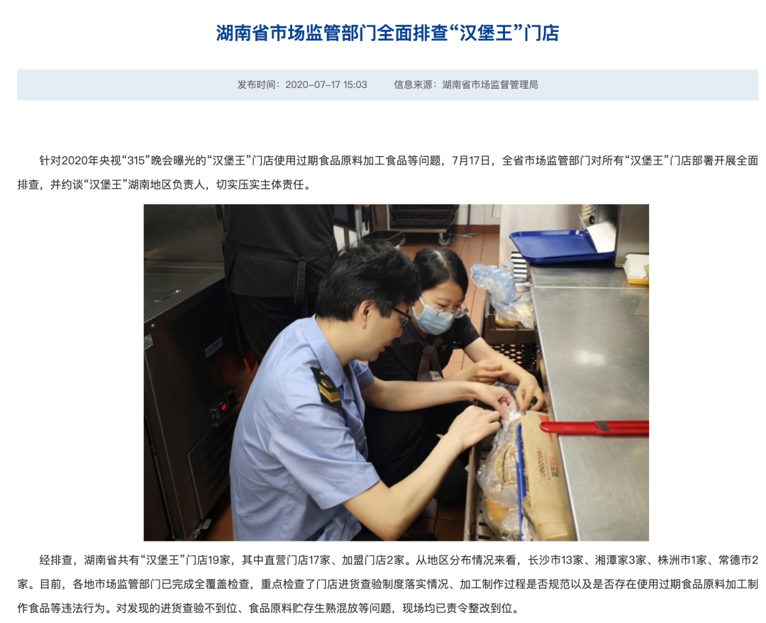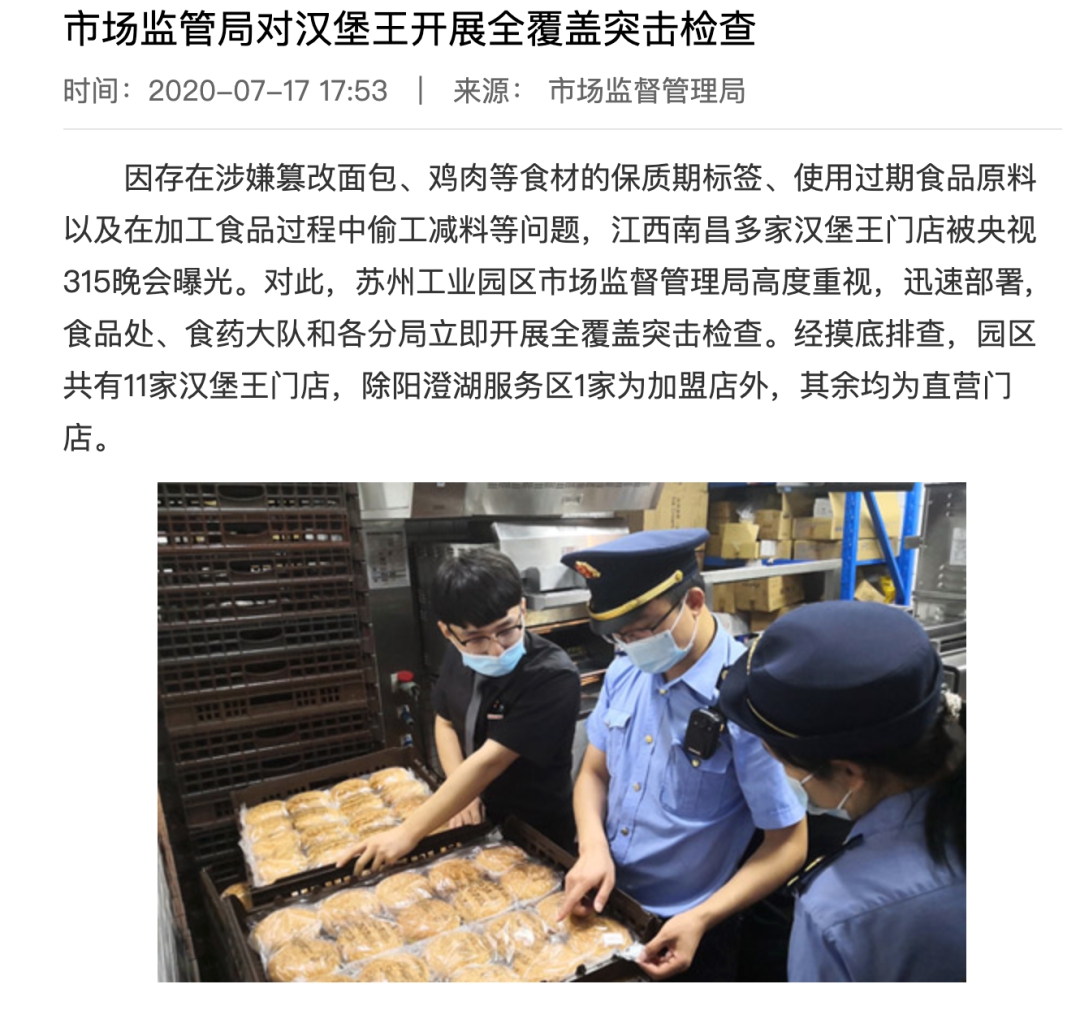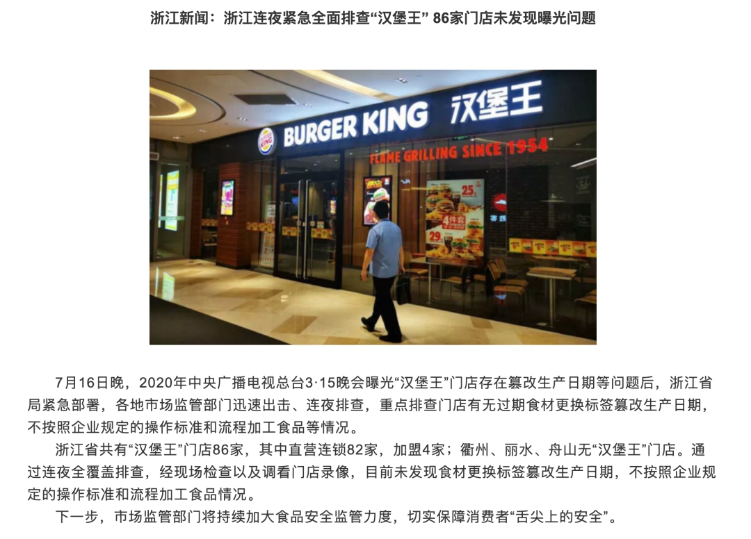 上海市市场监管局则针对曝光汉堡王使用过期原材料等问题,组织各区市场监管局连夜全覆盖检查该市门店,重点检查关注进货台账、报废记录、改保质期等有关的问题。