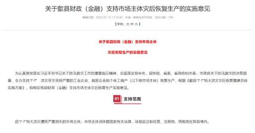7月16日,21世纪经济报道记者在歙县经开区里了解到,根据《歙县“7·7”特大洪灾灾后恢复重建总体实施方案》“关于歙县财政(金融)支持市场主体灾后恢复生产的实施意见”在当天已经出台。