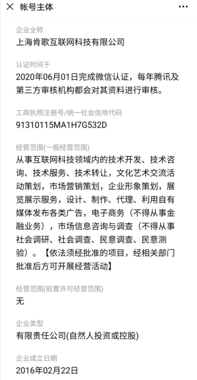 账号信息显示,其最早是2018年8月13日注册的“卖保×的来了大家快跑”,2020年6月3日改名为“世界灯火君”,背后的账号主体显示,这并非一个个人号,而是“上海肯歌互联网科技有限公司”。