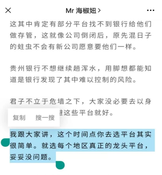 事实上,这个“Mr 海椒妞”就是一个网贷推手,他们自己也在文章中说了,介绍了很多平台,目的当然是给这些良莠不齐的网贷平台源源不断的输送韭菜。