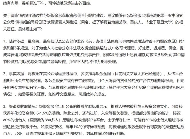 文中如此写到,“可以告这个海椒妞吗,跟着她链接投的图腾贷,牛板金,全雷了,饭饭(饭饭金服)也逾期了,结果她自己下车了,下车后把车门焊死,不知道她拿了多少好处”。