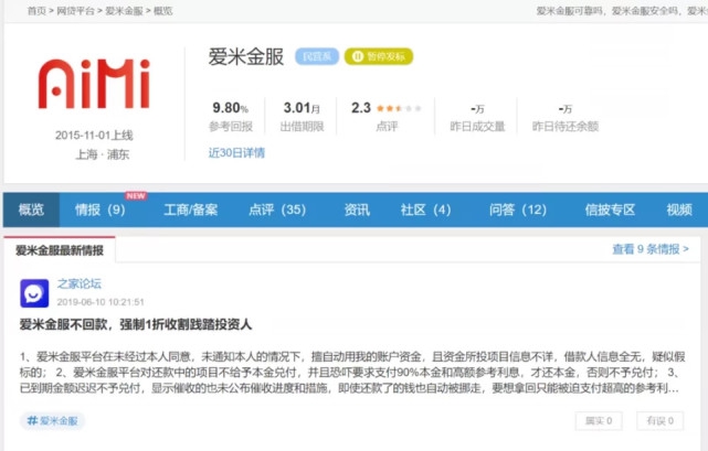 在一个名叫网贷之家的网站上,上海虎信金融信息服务有限公司的网贷平台爱米金服页面上,可以看到已经“停止发标”,讨论区全是对这个平台的投诉:“爱米理财怎么不见了,怎样能联系”,“爱米金服不回款,强制1折收割践踏投资人”,“爱米金服疑似是假标,不太可靠”,“爱米金服逾期不兑”。