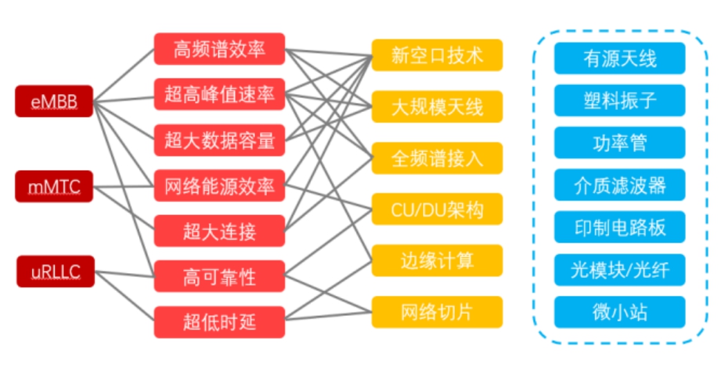 多样化场景需求要求5G具备多项关键能力。5G三大场景的极端差异化性能需求,要求5G比前几代移动通信性能更加出众,用户体验速率、连接数密度、端到端时延、单位面积容量等成为5G的关键性能指标。为了满足5G多项关键性能,5G网络和终端都发生较大的变化,相应的上游供应链价值和供应链企业与4G时代有所差异。