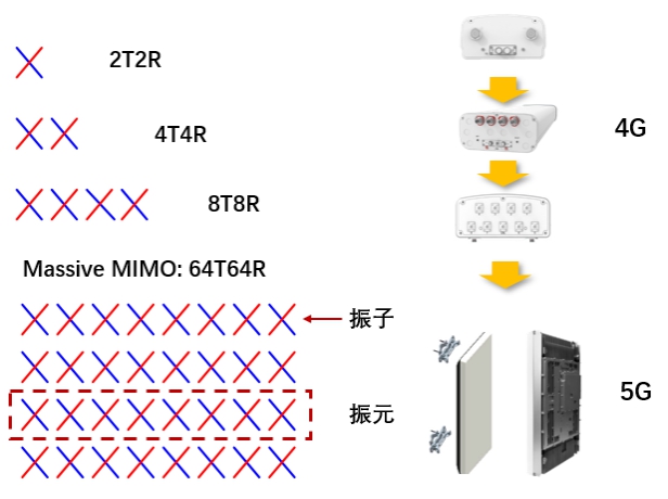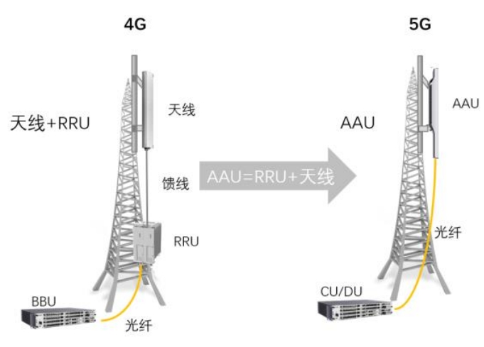 基站天线是能够有效地向空间某特定方向辐射电磁波或能够有效地接收空间某特定方向来的电磁波的装置。4G时代,基站天线主要由天线罩、天线振子、反射板、馈电网络、隔离片等构成。5G时代,有源天线AAU(有源天线处理单元)将RRU(射频拉远单元)与天线一体化集成,射频单元和天线整体设计,天线阵子、滤波器、PCB集成一体化,传输由光纤代替馈线,能够有效降低损耗,提高信号抗干扰能力。