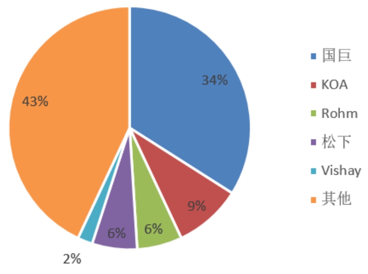 从竞争格局来看,台湾地区厂商国巨(Yageo)占据电阻市场34%的市场份额,是绝对龙头,其次的主要电阻厂商还有Rohm、KOA、松下、Vishay等,但占比都在10%以下,中国大陆电阻企业有顺络电子、风华高科等。