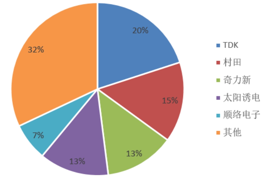 电感竞争格局相对集中,日系大厂位居前三。目前电感厂商竞争格局相对比较集中,日系厂商村田、TDK和太阳诱电位居前三,合计占比达40%,台湾地区奇力新和中国大陆厂商顺络电子紧随其后,根据2018年公司营业收入大致测算,顺络电子电感业务全球市占率约为7%,位列全球第五。