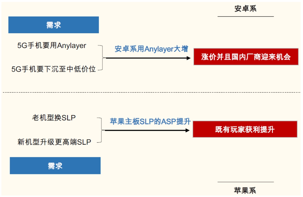 产品规格提升以及单机用量增加带来5G手机HDI单机价值量跃升。在5G手机芯片高集成小尺寸的情况下,手机主板从HDI(高密度互连多层板)向Anylayer(Anylayer HDI,是最高阶的HDI)再向SLP升级的趋势明显。对于安卓系手机来说,发展路径为:原采用Anylayer主板的机型主板继续升级+原未采用Anylayer主板的机型采用Anylayer;苹果手机:原采用Anylayer主板的机型升级为SLP+原采用SLP主板的机型继续升级。