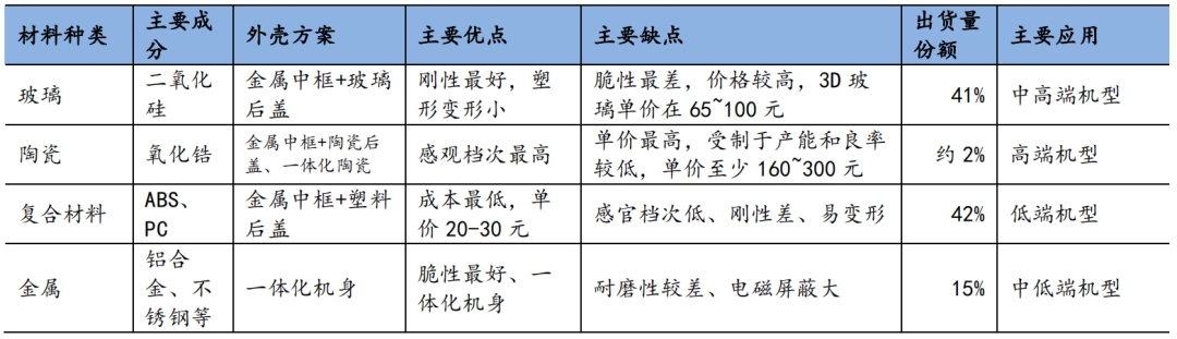 表4:手机背板(后盖)材料对比
