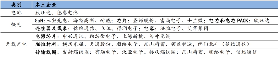 表6:手机能源管理各领域主要本土企业