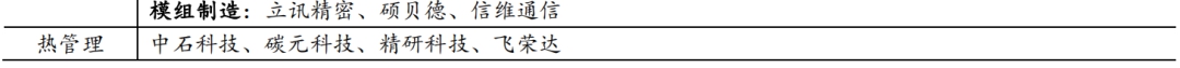 在射频系统变化的基础上,为保证及提升手机的性能及使用体验,随之受到影响的零组件包括:PCB、能源管理(电池、快充、散热等)、手机背板、部分被动元器件及连接器、存储器等。而显示屏模块、摄像头模块、指纹识别模块以及声学模块等则拥有相对独立的创新周期,与5G手机变化的关联度不大。