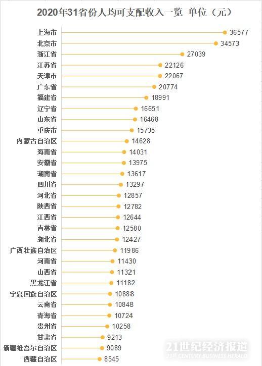 上海、北京、浙江、江苏、天津和广东,也是上半年人均可支配超过2万元的6个省份。福建、辽宁、山东和重庆,上半年人均可支配收入则超过1.5万元。